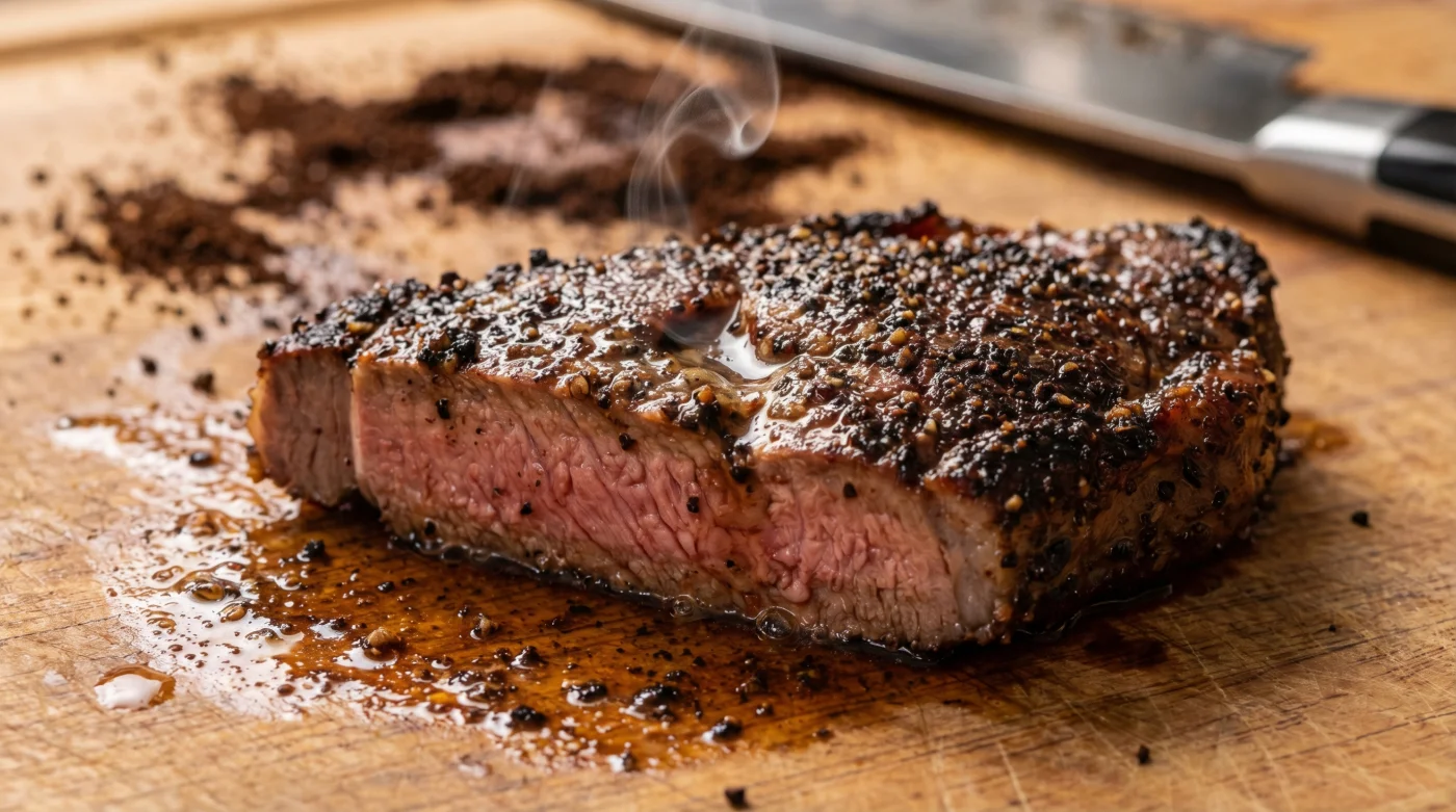 Es geht bei dieser Technik keineswegs darum, deinem teuren Rib-Eye-Steak den Geschmack eines süßen Cappuccinos aufzuzwingen. Vielmehr machst du dir ein physikalisches System auf geniale Weise zunutze. Der Kaffeesatz verhält sich auf der Fleischoberfläche wie ein mikroskopisches Netzwerk winziger, schwarzer Hitzespeicher. Sie bilden eine trockene Barriere, die bei Kontakt mit dem heißen Fett in der Pfanne sofort und gleichmäßig karamellisiert.
